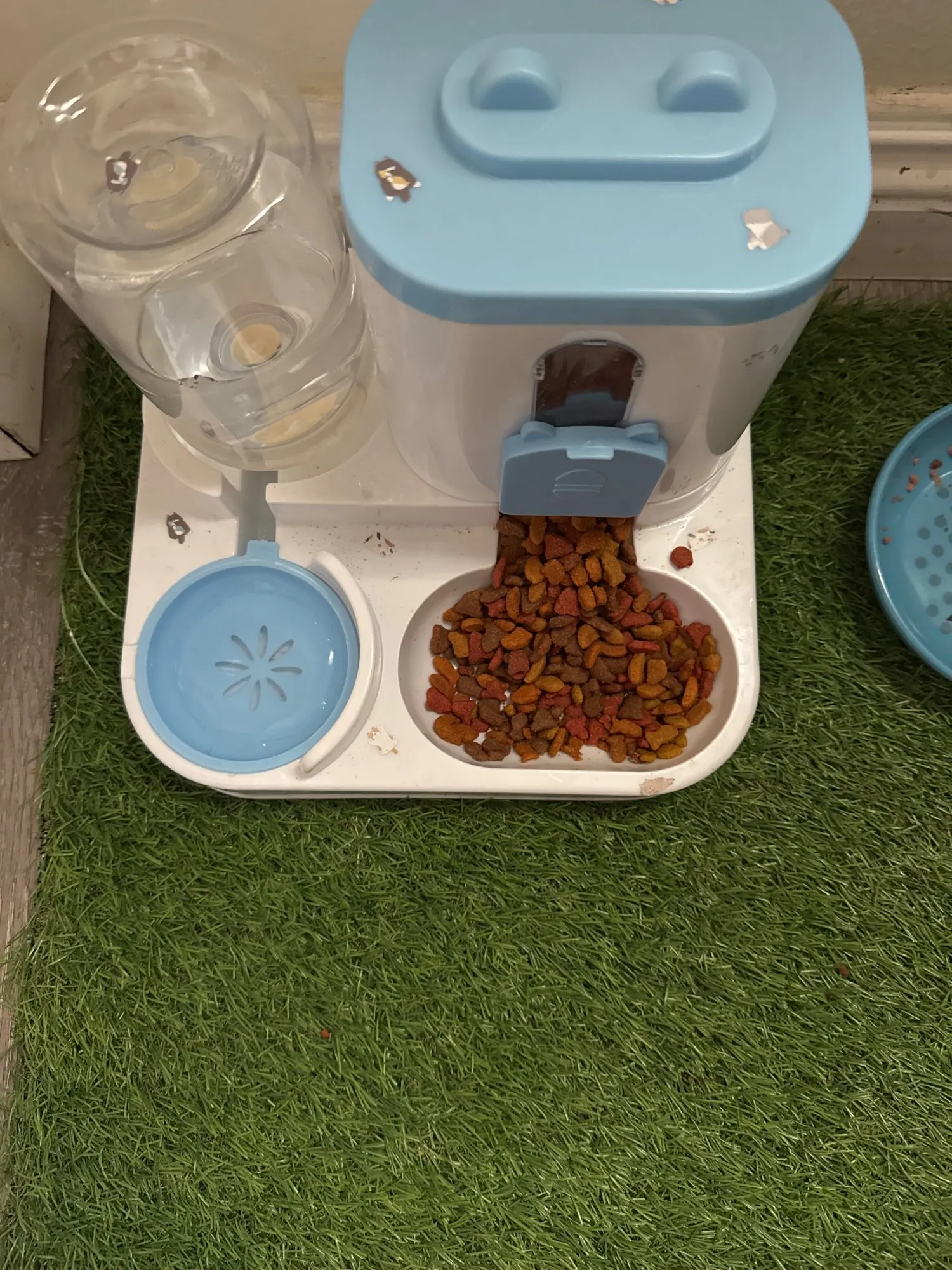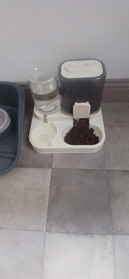 My cat doesn’t scatter the dry food — everything stays clean and tidy. The food comes out well, no clogging. The water section works fine too, but my cat just doesn’t like drinking next to his food — he has another water bowl in a different spot, so that’s just his personal habit. Overall, i’m happy with the purchase: it looks neat, stands nicely in the corner, and keeps everything clean. Definitely worth the money! 🐾