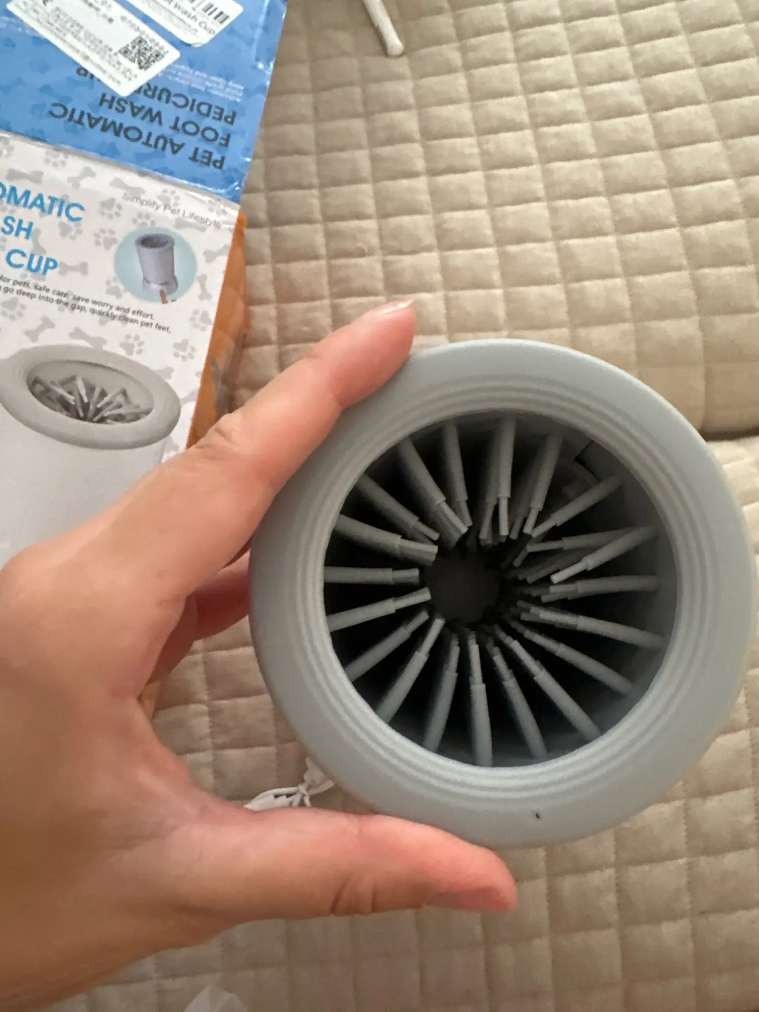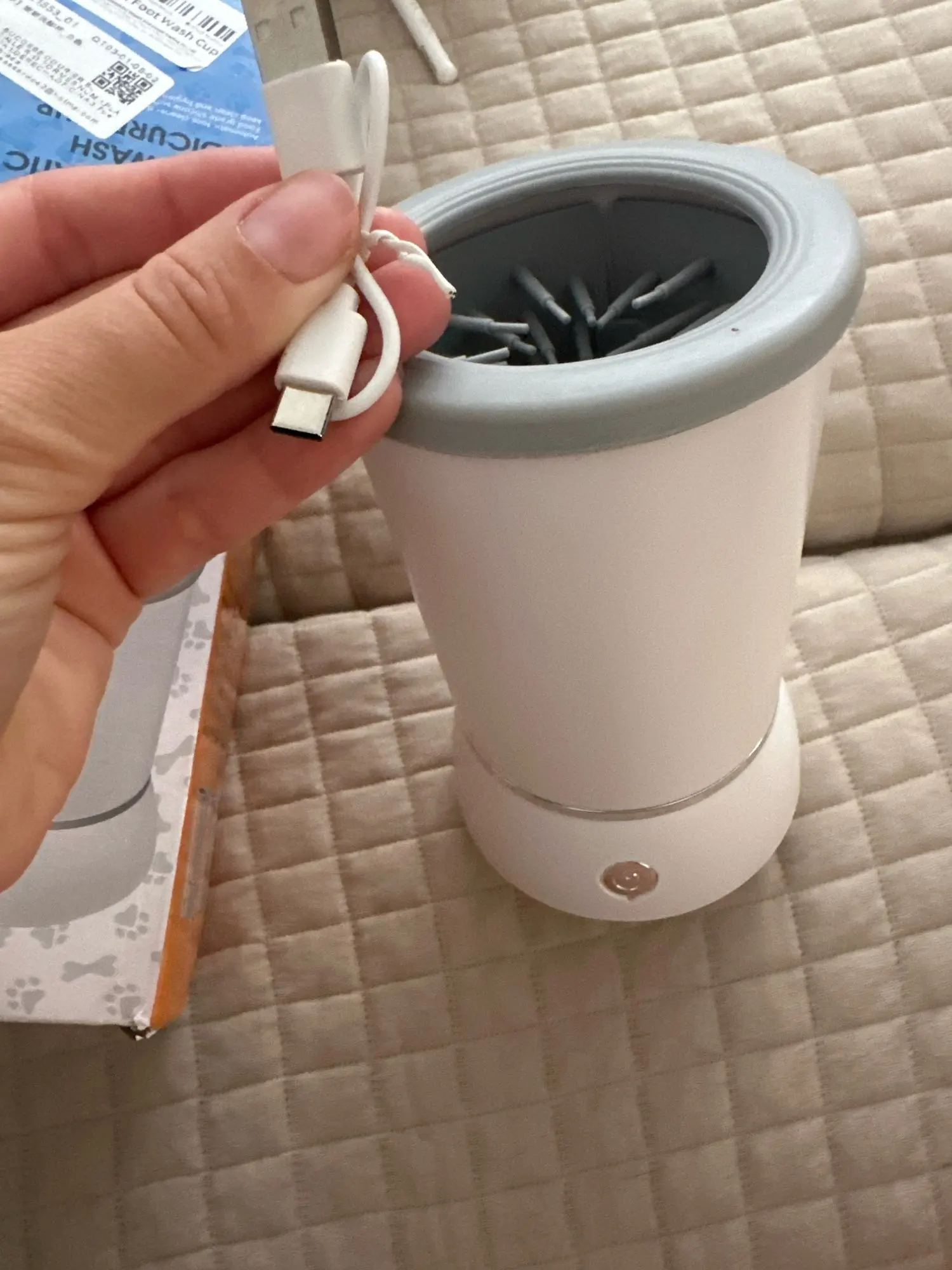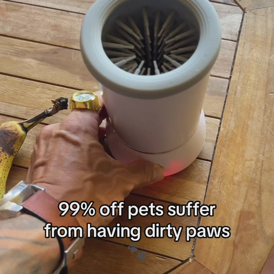 - Press the on button to wash the feet, gently moving the cup up and down, allowing the bristles to clean all of the paw.