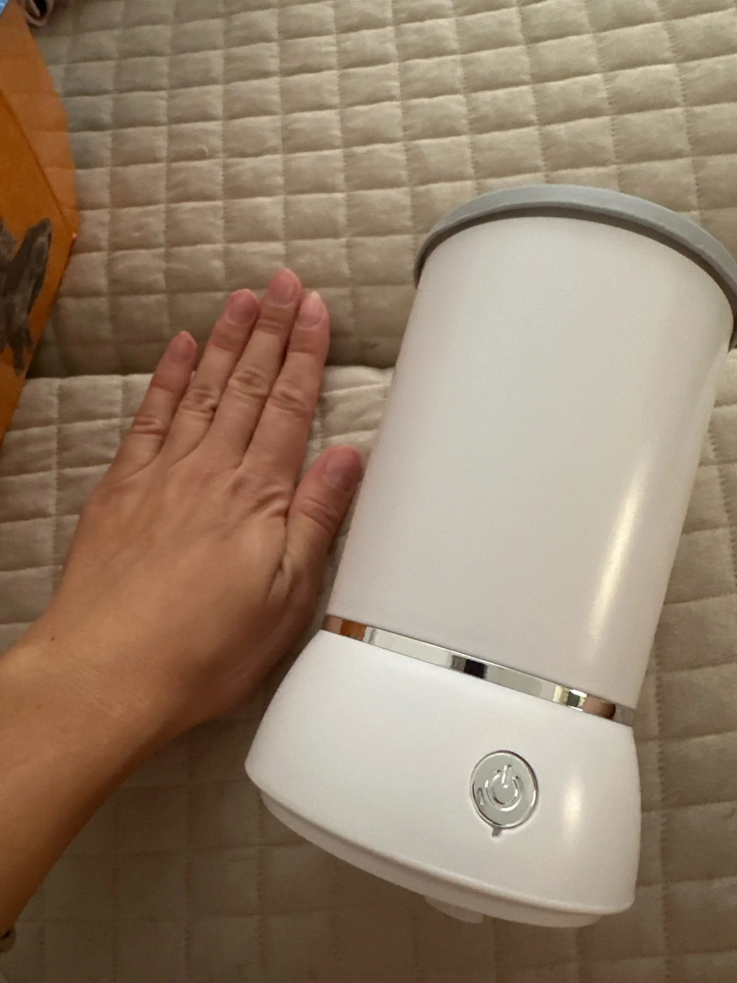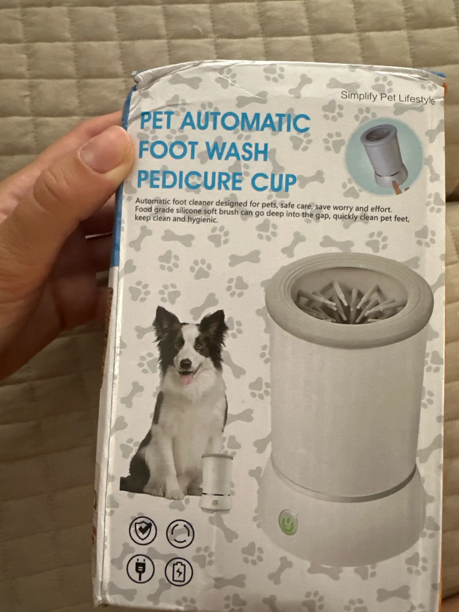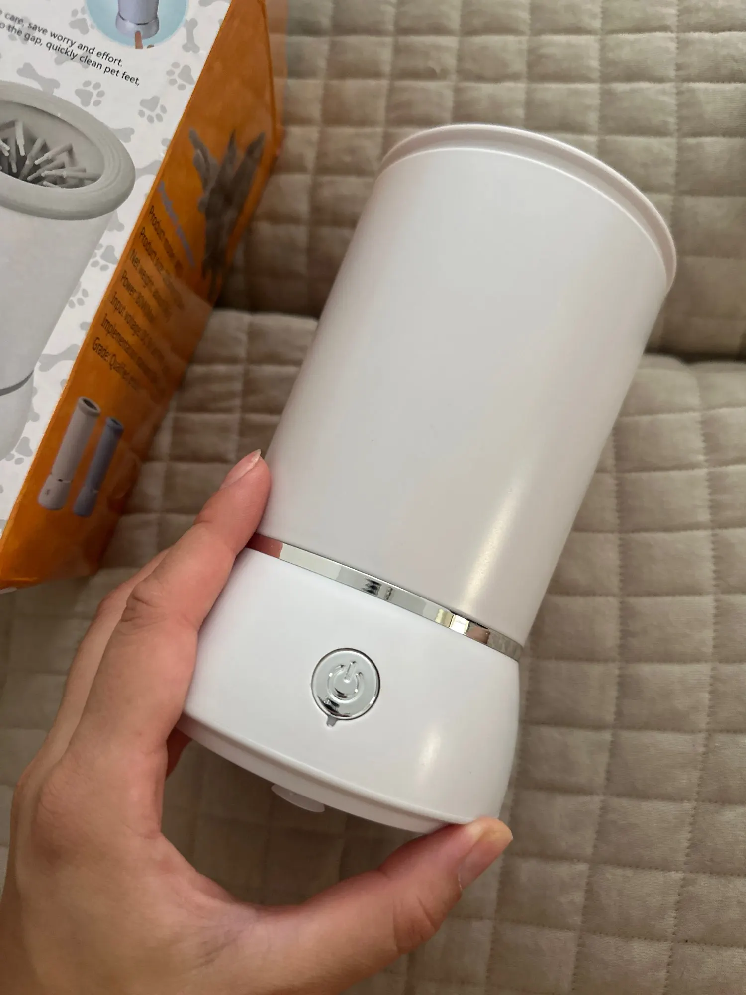 - Press the on button to wash the feet, gently moving the cup up and down, allowing the bristles to clean all of the paw.